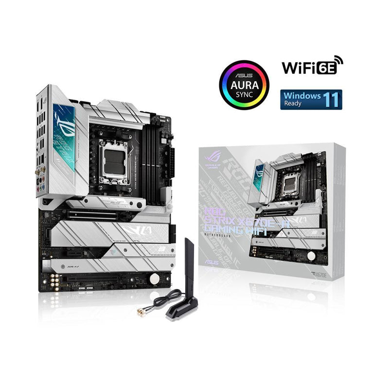 Suit up for the next gen with the stylish ROG Strix X670E-A Gaming WiFi. Its black PCB and white accents neatly contrast silver-colored heatsinks that emphasize premium power delivery for AMD Ryzen 7000 Series processors. Exclusive ROG overclocking utilities, full PCIe 5.0 capabilities, and DDR5 support are woven in alongside, adding uniquely tailored performance and AM5 essentials to your gaming build.