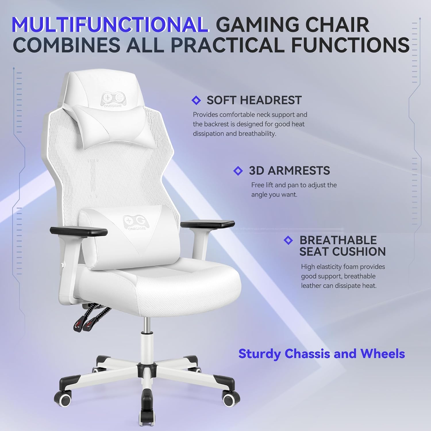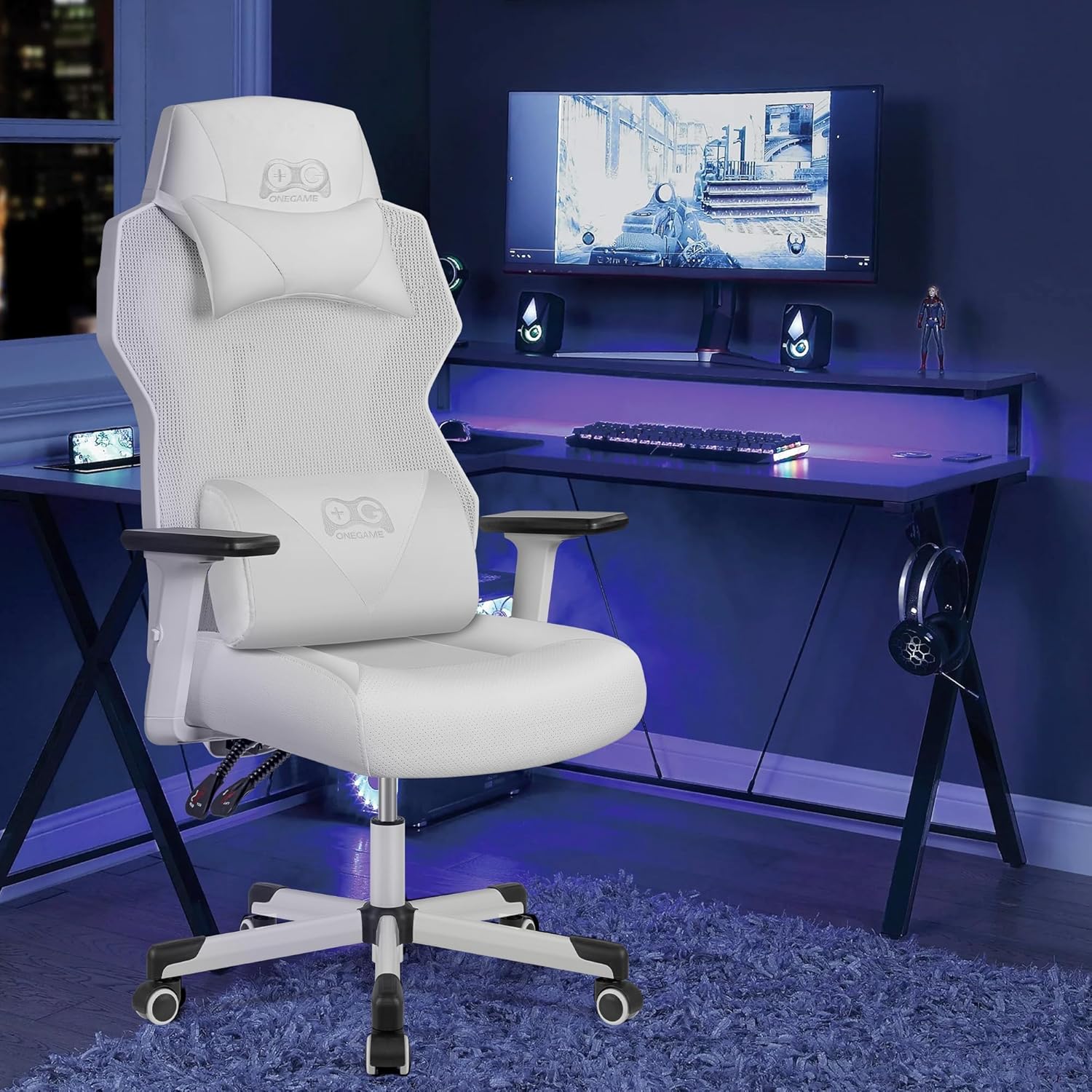 OneGame Video Gaming Chair, Breathable Swivel Chair Adjustable Backrest Ergonomic PC with Lumbar Support, White