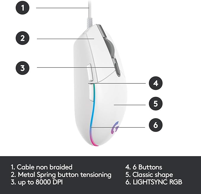 Logitech G203 2nd Gen Wired Gaming Mouse, 8,000 DPI, Rainbow Optical Effect LIGHTSYNC RGB, 6 Programmable Buttons, On-Board Memory, Screen Mapping, PC/Mac Computer and Laptop Compatible - White