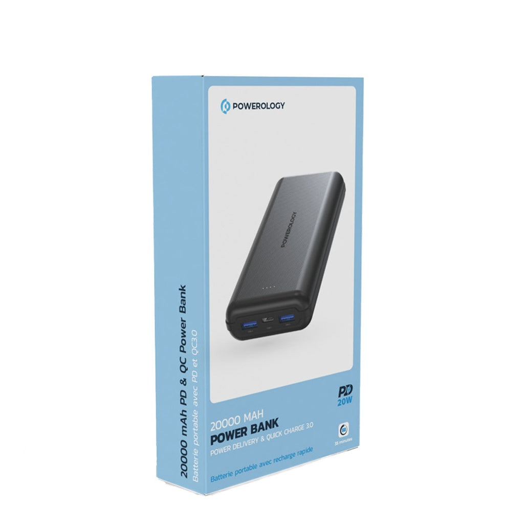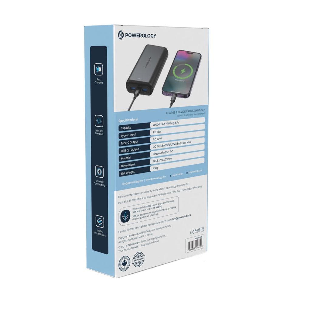 With the Powerology 20000mAh PD&QC Power Bank, keep ahead while fully charged! Enjoy 20W PD fast charging to bring out the full power of your devices, which can go from 0% to 60% in just 35 minutes. Its lightweight and small size, massive 20,000mAh capacity, and cross-platform compatibility make it the ideal power partner for all your devices. It provides fast and efficient charging of your devices with a Type-C input of 18W and output of 20W. Since safety is so important, it is made of fireproof ABS+PC material. Combined strength, speed, and safety. Don't just participate; rule the field with the Powerology 20000mAh PD&QC Power Bank. You'll stay powered by powerology!