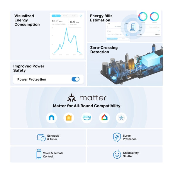 • Zero-Crossing Detection: Advanced technology that reduces wear on the internal components, making this power strip last 9x longer than standard smart plugs.9