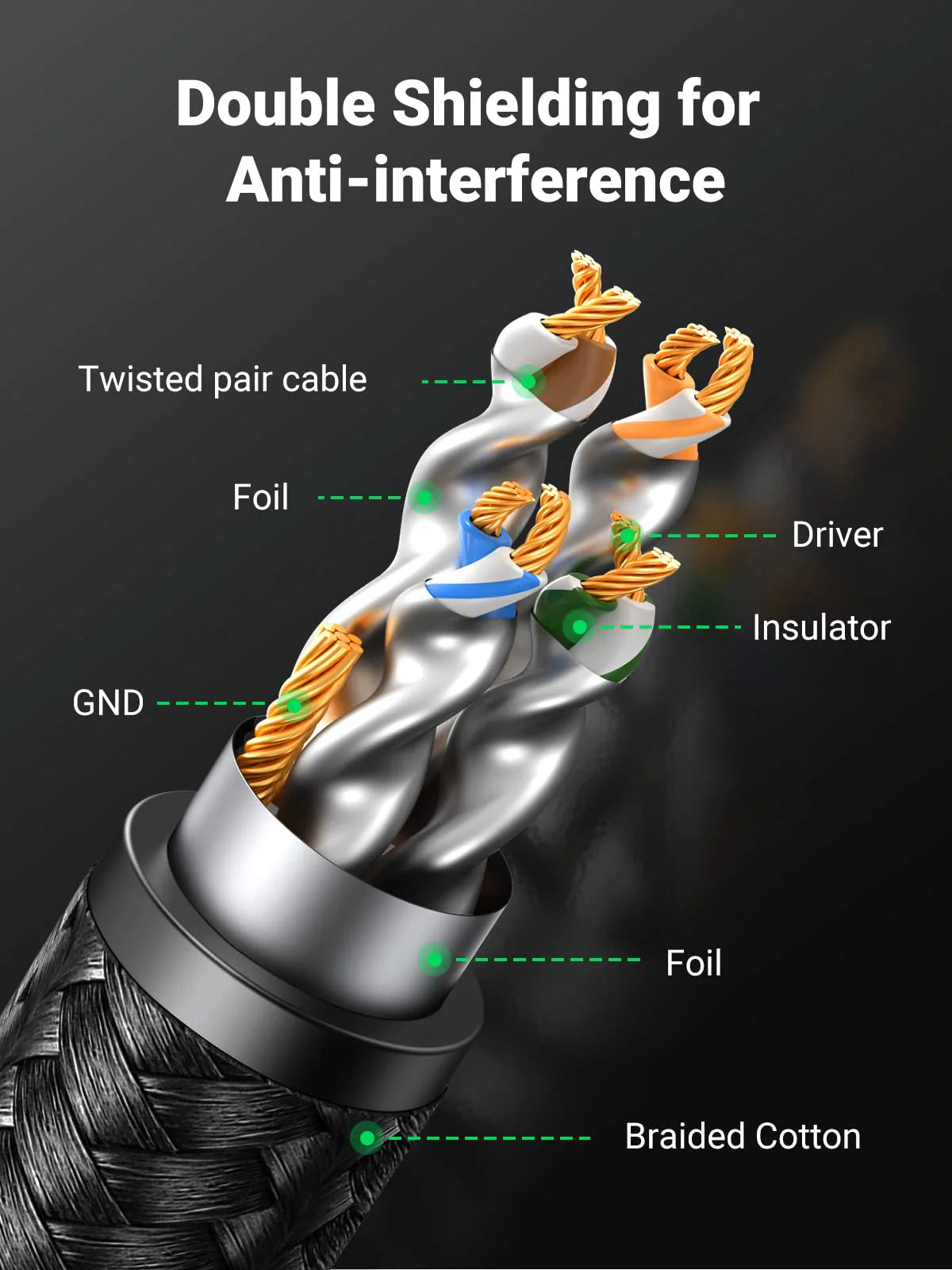 • Excellent Anti-interference: UGREEN internet cables are designed with 4 shielded foiled twisted pairs (F/FTP) and an aluminum foil shielding layer. This design can greatly reduce interference and crosstalk from adjacent pairs and other cables, making network speed faster and more stable.