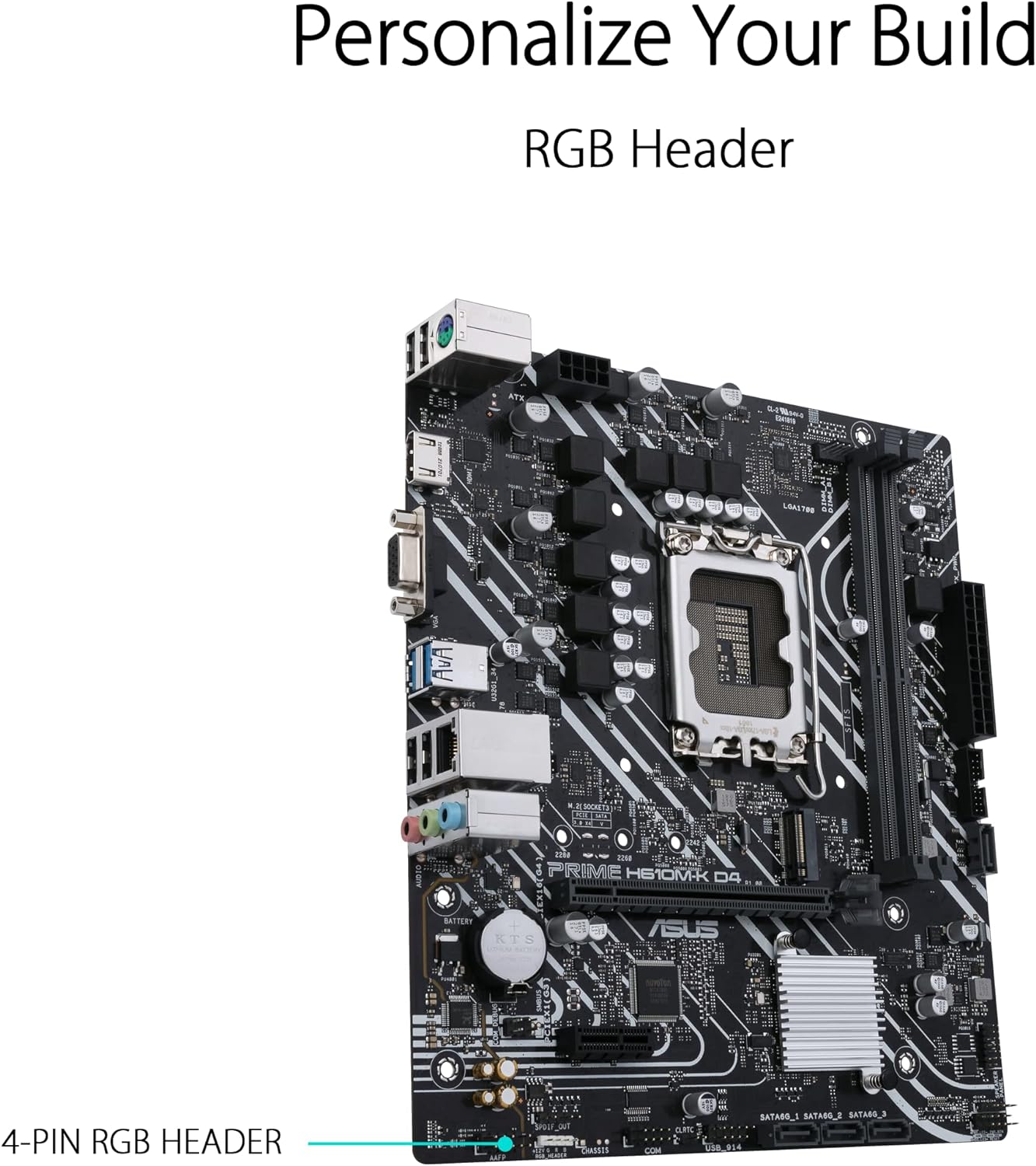 Asus Prime H610M-K D4 Mic ATX Motherboard, DDR4 Support, LGA 1700, PCIe 4.0, M.2 Slot, Realtek 1Gb Ethernet, HDMI, D-Sub, USB 3.2 Gen, SATA 6 Gbps, COM/RGB Header, 5X Protection III.