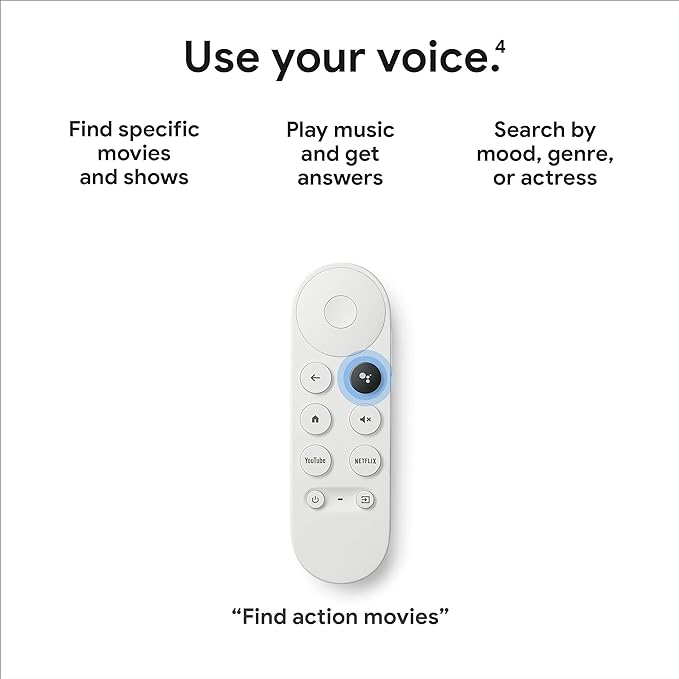 - Press the Google Assistant[4] button on the remote and use voice search to find specific shows, or search by mood, genre, actress, and more; control the volume, switch inputs, play music, and get answers on-screen