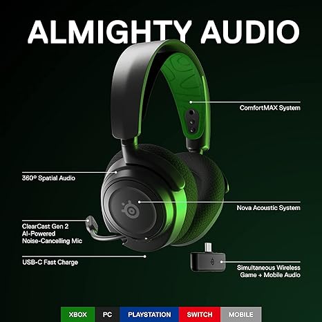 - Multi-Platform Support - Bring the Arctis Nova 7 to your favorite platform, such as Xbox, PC, Mac, PlayStation, or Switch, with a pocket-size USB-C dongle for lag-free Quantum 2.0 Wireless 2.4GHz. USB-A adapter included